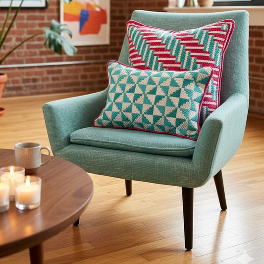 Rooted in a shared design heritage, each piece honors centuries-old craft through a contemporary lens. The bold and bright Shaker Tape pattern exemplifies how DOF reinterprets North American and South Asian folk art traditions in this limited-edition collection of embroidered pillows.