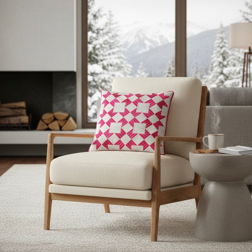 A radiant fusion of American heritage and South Asian artistry, the BARN STAR PILLOW is part of DOF’s Limited Edition Collection — a vibrant reimagining of the iconic Amish barn star motif through the intricate lens of Phulkari-style embroidery.